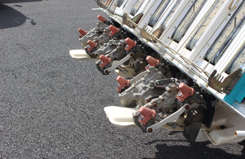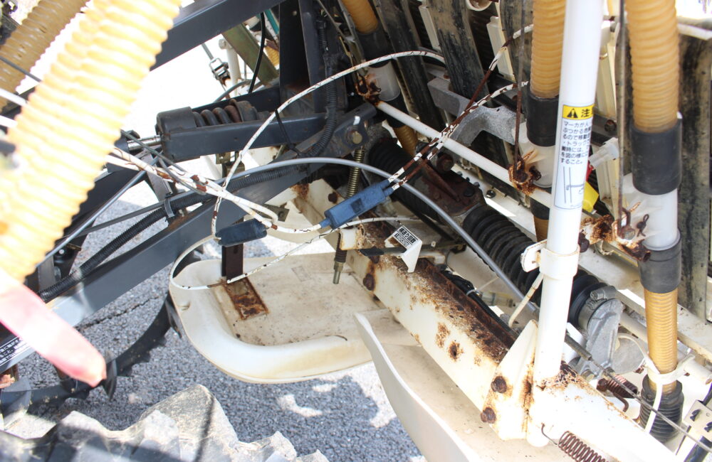 ●左から二番目、苗切れ警報スイッチ破損(矢印参照)