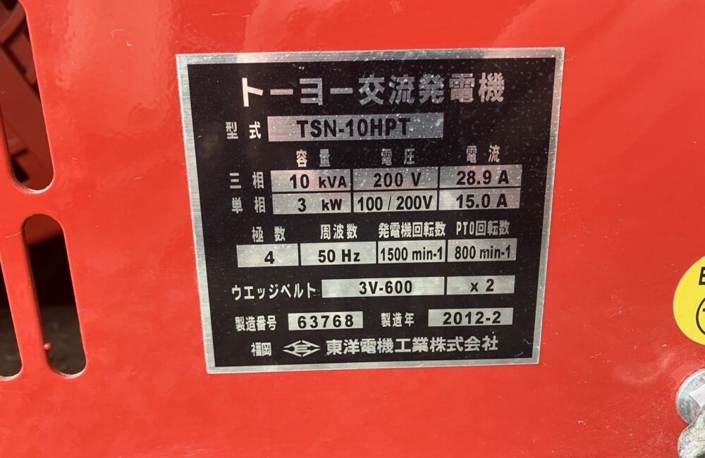トーヨー 中古 発電機 TSN-10HPT 動力別途相談 一関
