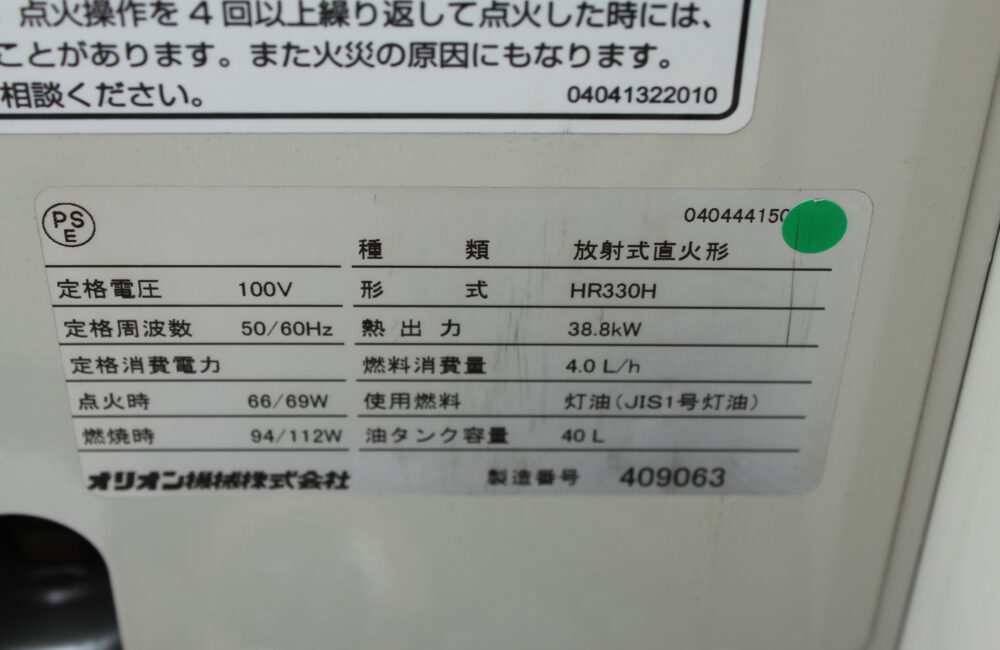 オリオン 中古 赤外線暖房機 HR330H